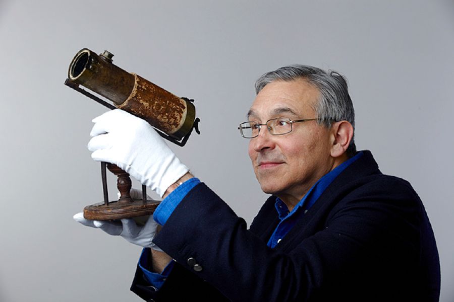 图5. Carlos Frenk 在皇家学会图书馆拿着牛顿制作的望远镜。