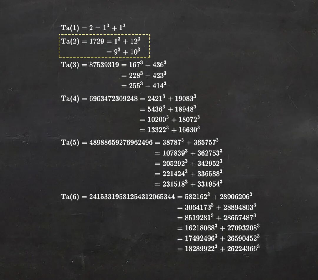 ○ “的士数”Ta(n)被定义为,能以n种方式表示成两个立方数之和的最小的数字。