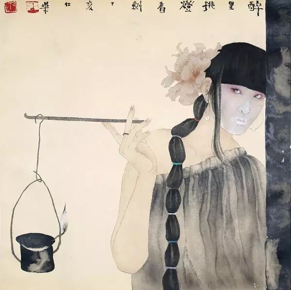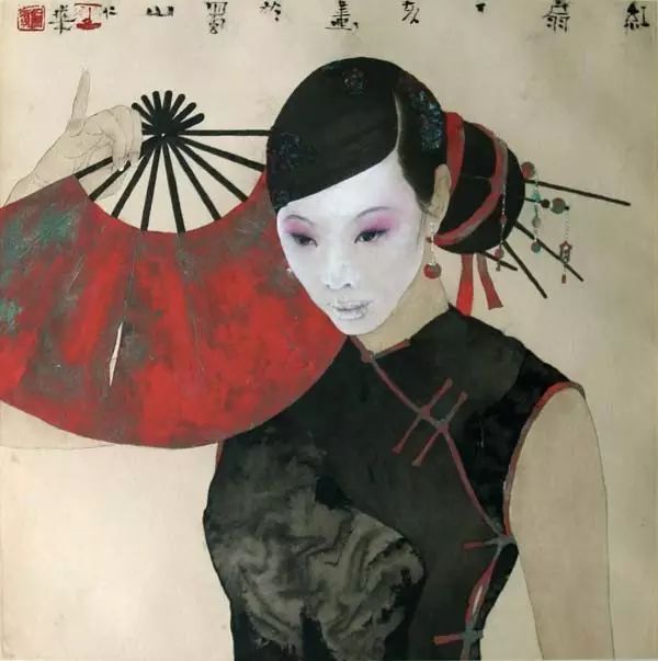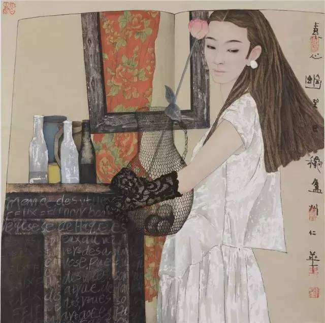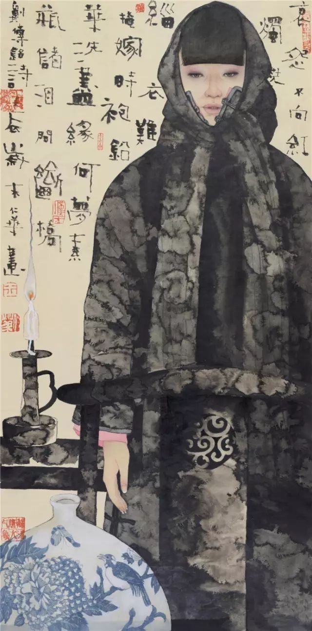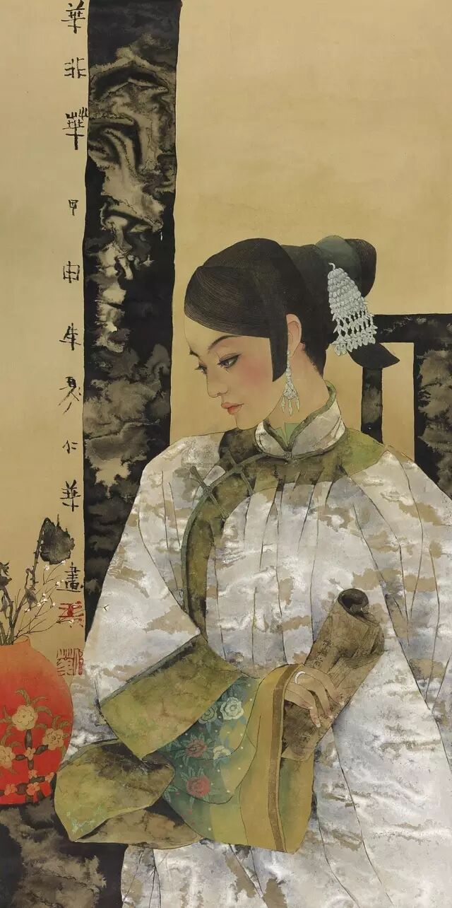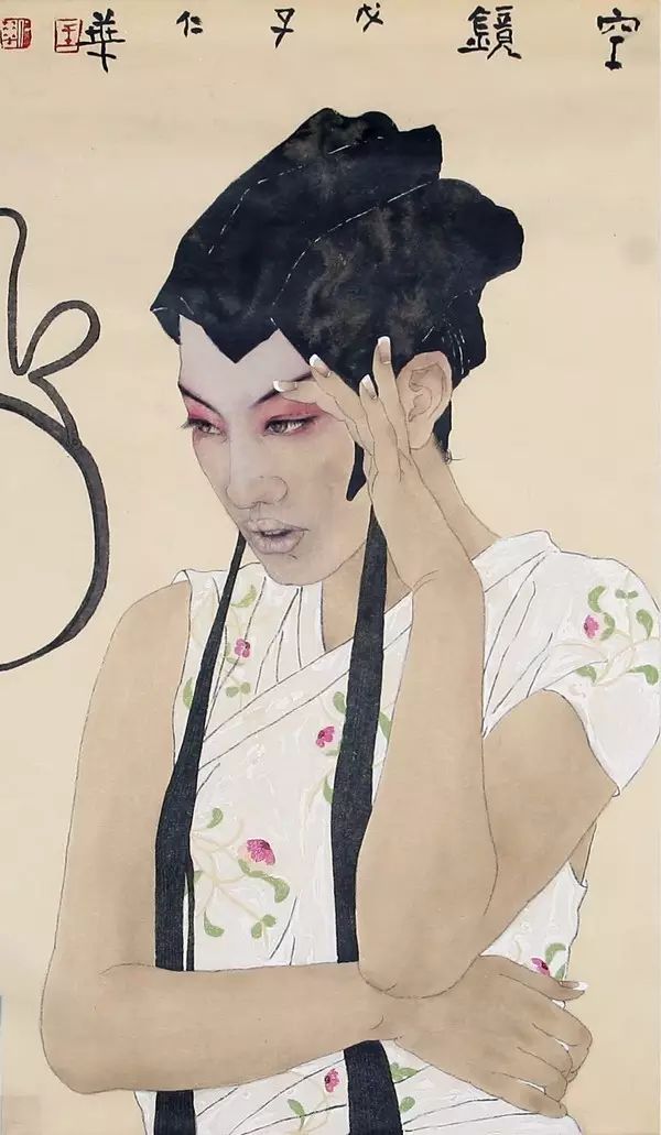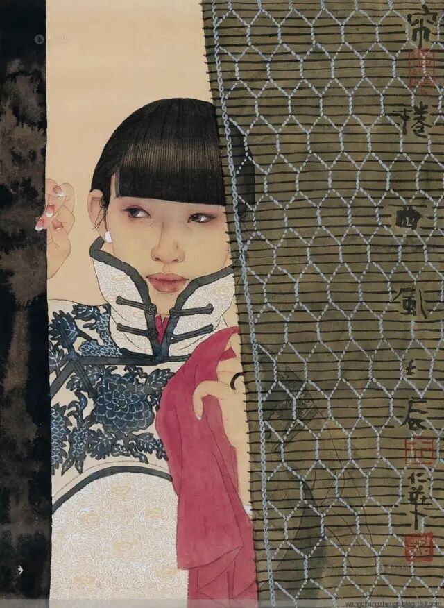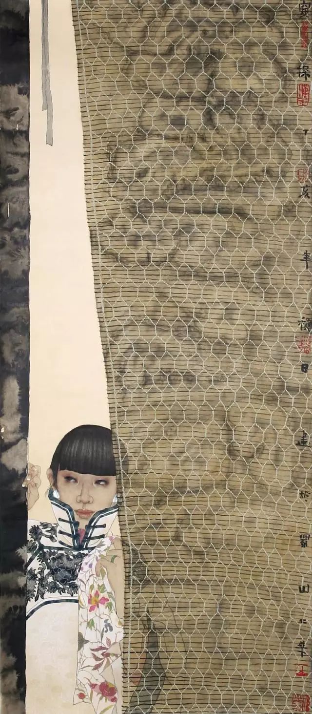 画中一位古典女子,掀开席帘向外窥探,巧妙将新旧古今、个人与世界隐喻于里面。