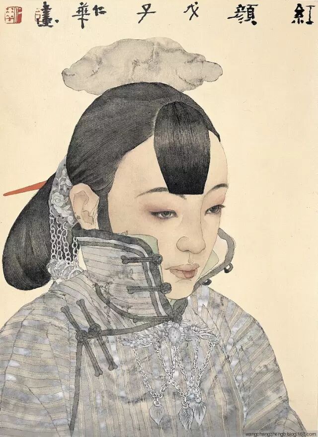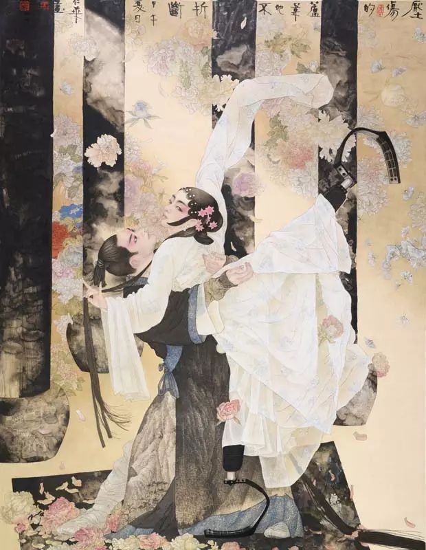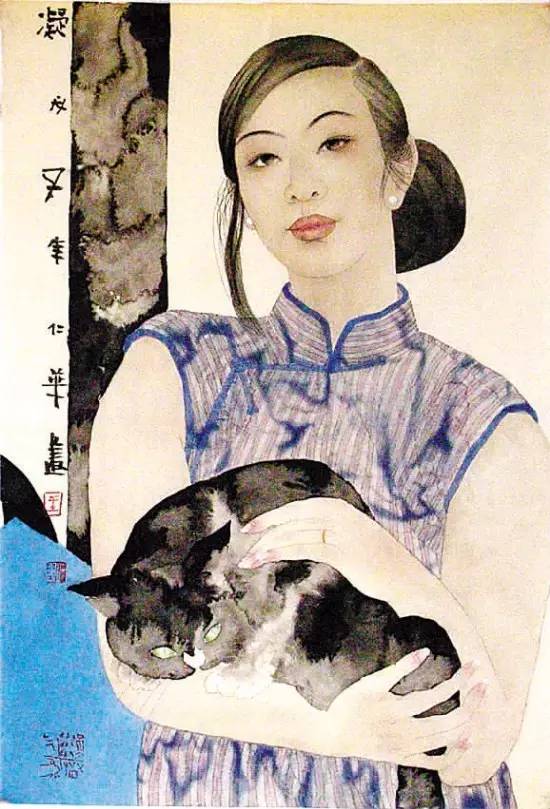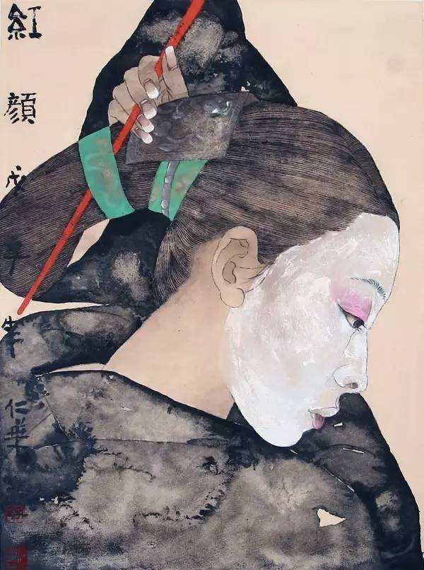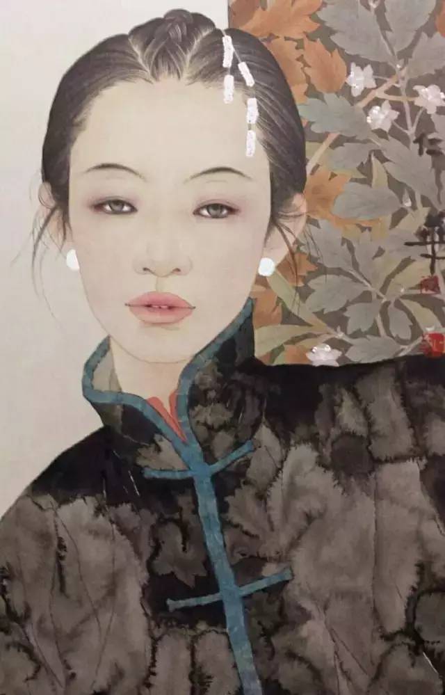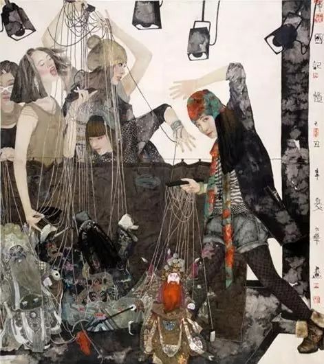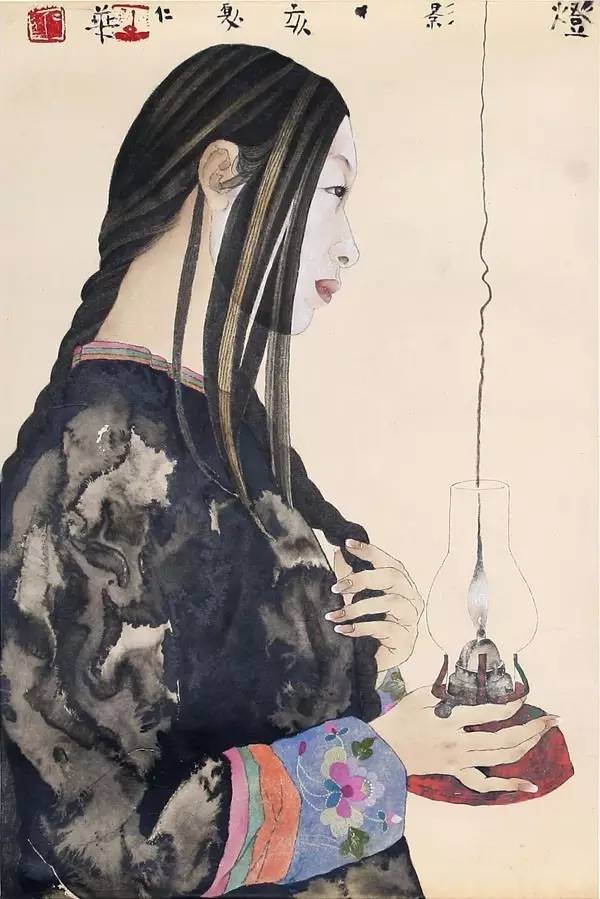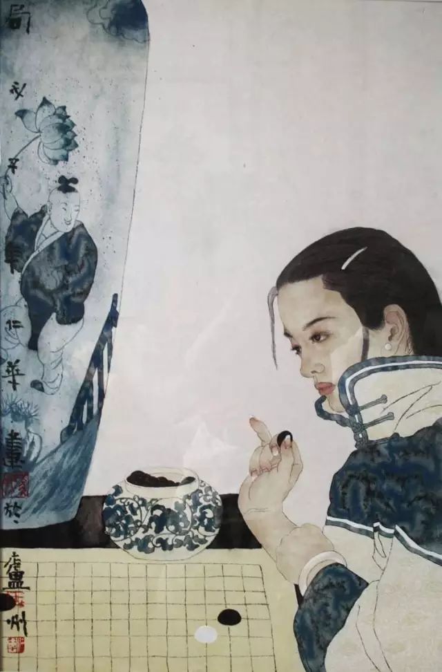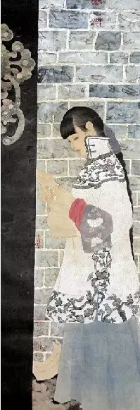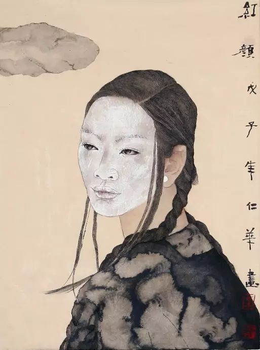 画中一位古典女子,掀开席帘向外窥探,巧妙将新旧古今、个人与世界隐喻于里面。