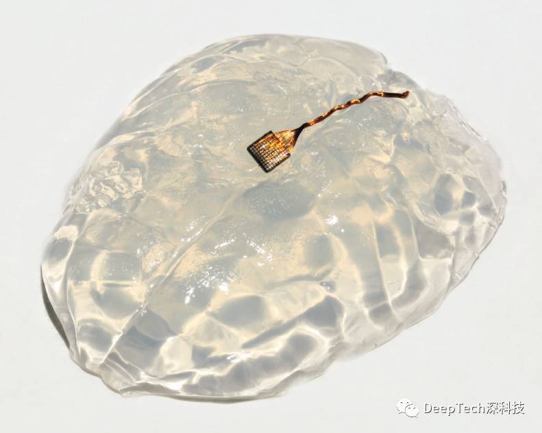 左:一个带电极的大脑阅读芯片的特写。右:模拟脊髓的柔性电极。