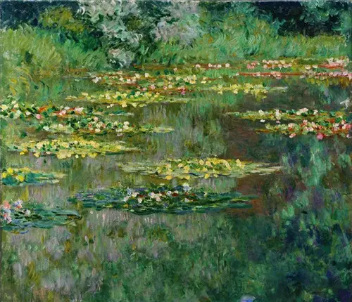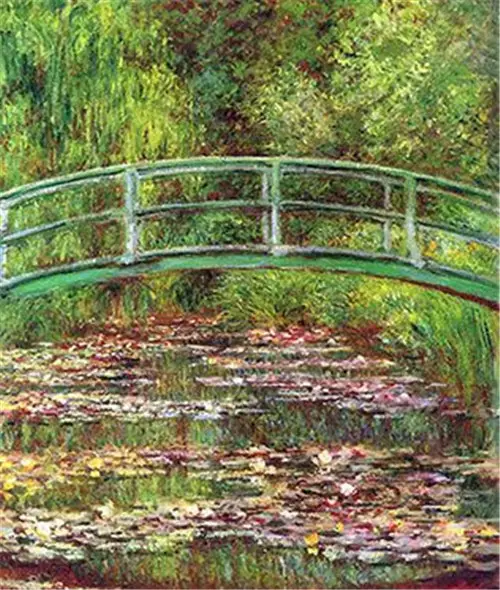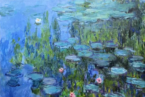1890年代,莫奈开始专注而且持续的以“睡莲”主题进行创作。即使后来视力开始出现问题,但他仍继续绘画,而且还在画睡莲,并且越画越大。 莫奈一生创作了60幅左右的“睡莲”组画,水与花交融的现实场景正来自园中的日本花园。