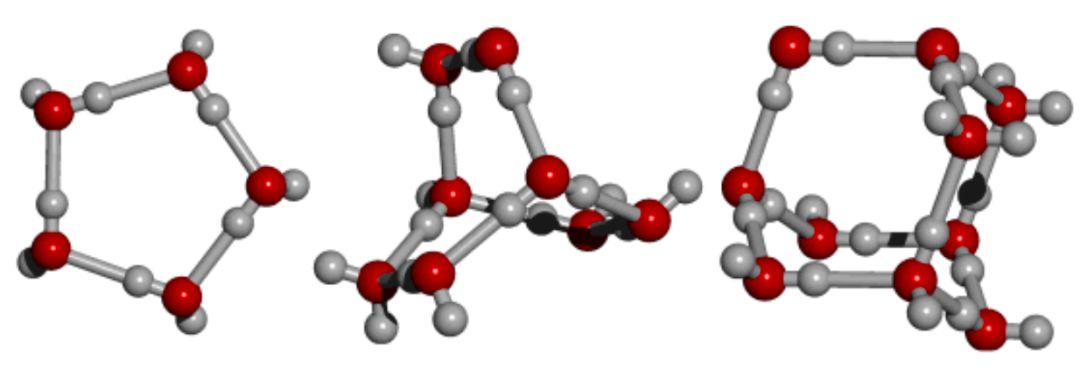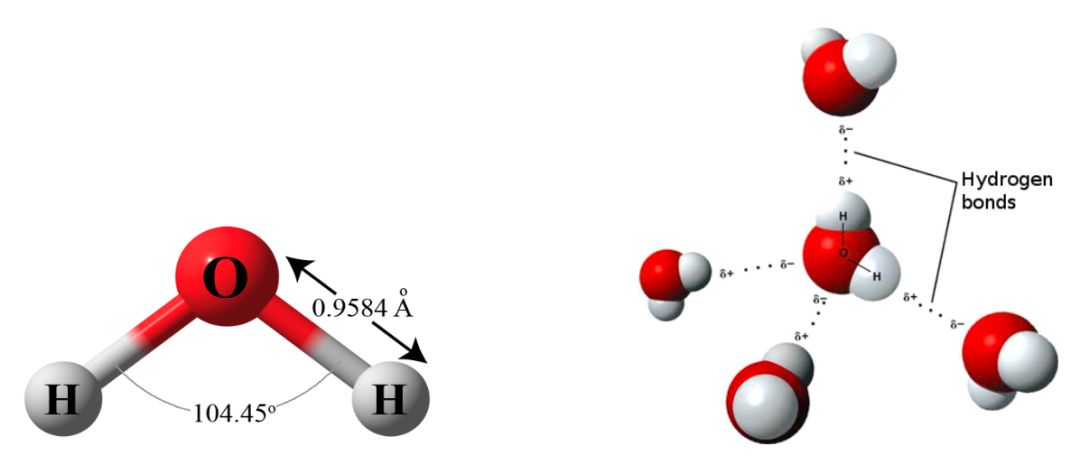 人类对水充满了好奇,想知道它是什么样的物质,直到有一天化学家发现氢气和氧气一起燃烧得到的就是水。水分子为H2O,是三原子分子,两个氢氧键的键长~0.96Å,夹角约为104.45°,很简单、很无辜的样子(图5)。然而,这种分子的简单是一种极具欺骗性的简单,由其构成的水之性质之奇异与复杂却让科学家头疼不已。在聚集体中,水分子会和多达4个其它水分子通过氢键相结合(图5),水分子会形成大小不同的团簇(图6),且这些团簇是动态的,在皮秒(1ps=10-12s)量级的时间尺度上不断地分裂、重组。水分子中H-O键的键长和键角,以及分子间氢键的键长与取向,都可以在较大的范围内灵活地调节,因此,也就容易理解为什么水有那么复杂多样的结构了。