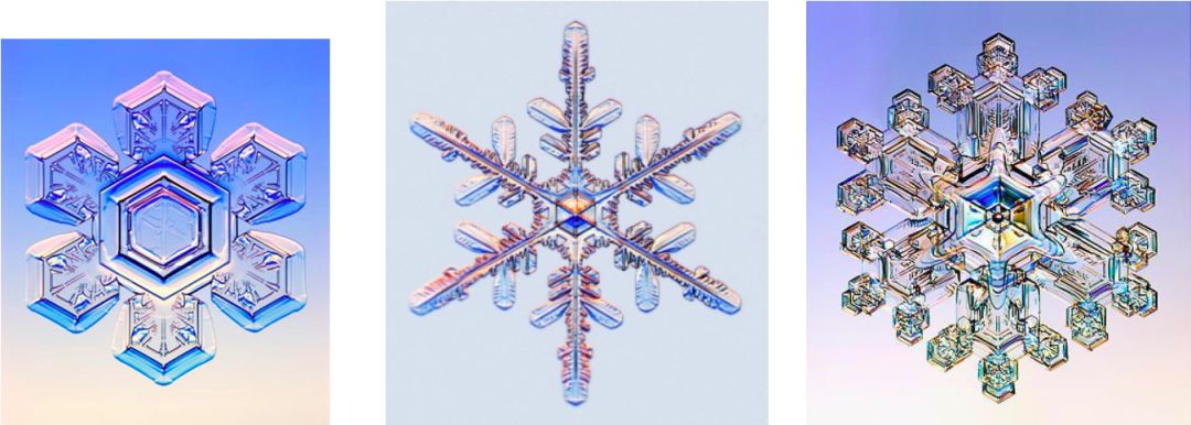 水的小尺寸固体也各具特色。水的小尺寸固体包括雪、霜、冻雨、冰雹、雾凇、软雹等等[3, 4]。雪花基本都呈六角对称的形状,但是却很难找到两片形状相同的(图11),这简直太神奇了。据信,软雹(graupel)下落时同上升的温暖水蒸气摩擦,是云层带电的原因。如何在实验室再现和证实这个过程,也是一个难题。