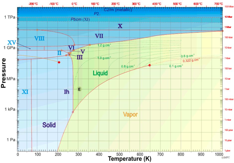 如果我们考虑冰的结构,并考察更高压力的区域,我们会得到如图9中的相图。注意,在液固界限斜率dp/dT<0的部分,液体毗连的冰是Ih相的冰,这种结构的冰在TP 参数(1 atm, 0°C)附近的密度为~0.9 g/cm3。这种能浮在水面上的冰是特例而不具普遍性(谢天谢地!)。在0.4 GPa以上部分的液固界限斜率dp/dT>0。目前已知冰的晶体结构有16种之多。
