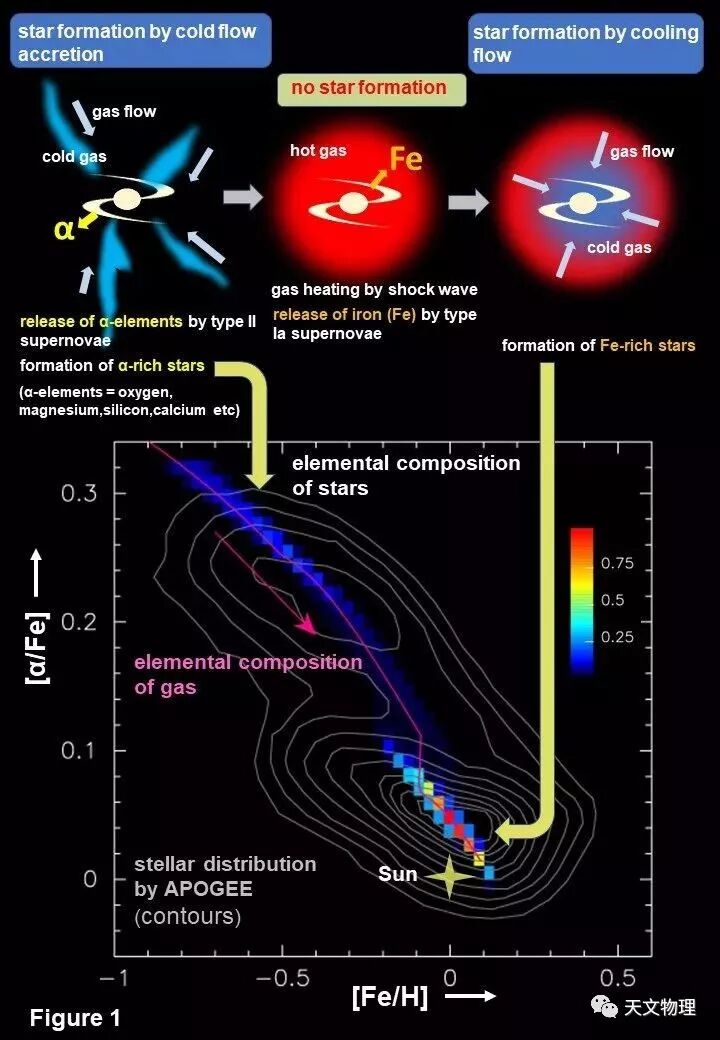 Masafumi Noguchi对银河系历史的描述始于冷气流流入星系(冷气流吸积)和恒星形成时。在此期间释放出来的气体迅速开始积累α-elements短暂的II型超新星爆炸,因此这些第一代恒星α-elements丰富。70亿年前,当冲击波出现并将气体加热到高温时,气体停止流入星系,恒星停止形成。长周期Ia型超新星在此期间的延迟爆炸将铁注入到气体中并改变其原有元素的组成。