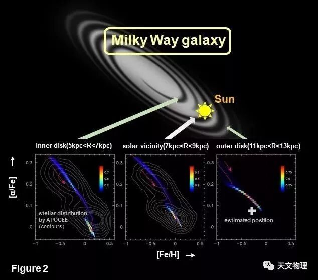 银河系的历史被铭刻在恒星的元素组成中,因为恒星继承了它们形成时的气体成分,恒星“记忆”了它们形成时的气体元素丰度。太阳附近有两组不同成分的恒星。一组富含α-elements如氧、镁和硅,另一种含有大量的铁。Misha Haywood(巴黎天文台)及其同事最近的观察发现,这种现象在银河系的一大片区域普遍存在。这种二分法的起源尚不清楚,Masafumi Noguchi是模型为这个长期存在的谜题提供了答案。