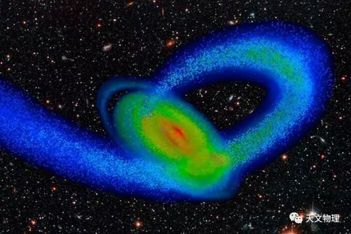 银河系与一个矮星系的潮汐相互作用摄动,正如n体模拟所预测的那样。所观察到的星盘上方和下方的位置,用来测试摄动情况。图片版权:T. Mueller/C. Laporte/NASA/JPL-Caletch