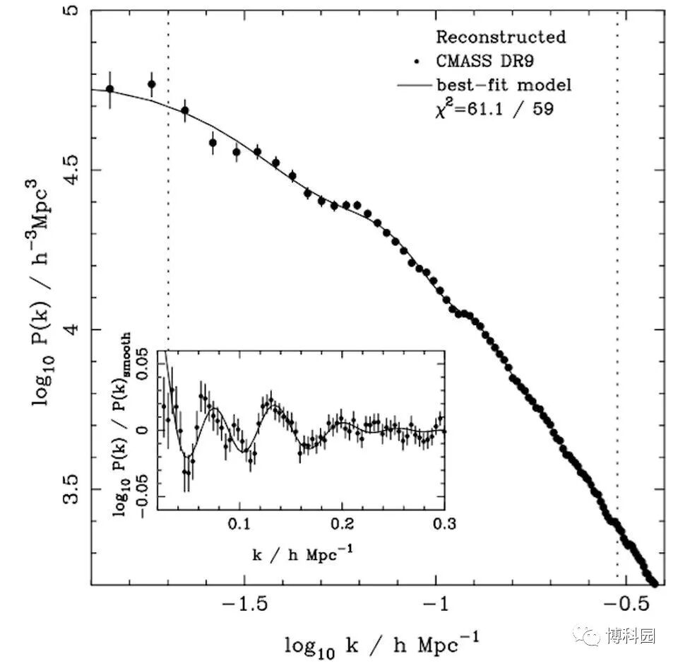 图注:大尺度的聚类数据(点)和宇宙的预测有85%的暗物质和15%的正常物质(实线)匹配得非常好。没有中断表示暗物质的温度(和寒冷); 摆动的大小表示正常物质与暗物质的比率。图片版权:L. Anderson et al. (2012), for the Sloan Digital Sky Survey