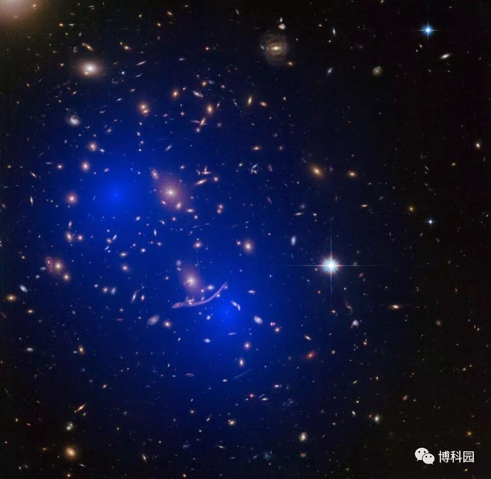 图注:通过引力透镜重建的星系团Abell 370的质量分布显示了两个大质量弥漫性晕圈,与暗物质和两个合并聚类相一致,以产生我们在这里观测到的结果。总体而言,围绕并穿过每个星系,星系团和大量正常物质的存在为5倍的暗物质。图片版权:NASA, ESA, D. Harvey (École Polytechnique Fédérale de Lausanne, Switzerland), R. Massey (Durham University, UK), the Hubble SM4 ERO Team and ST-ECF