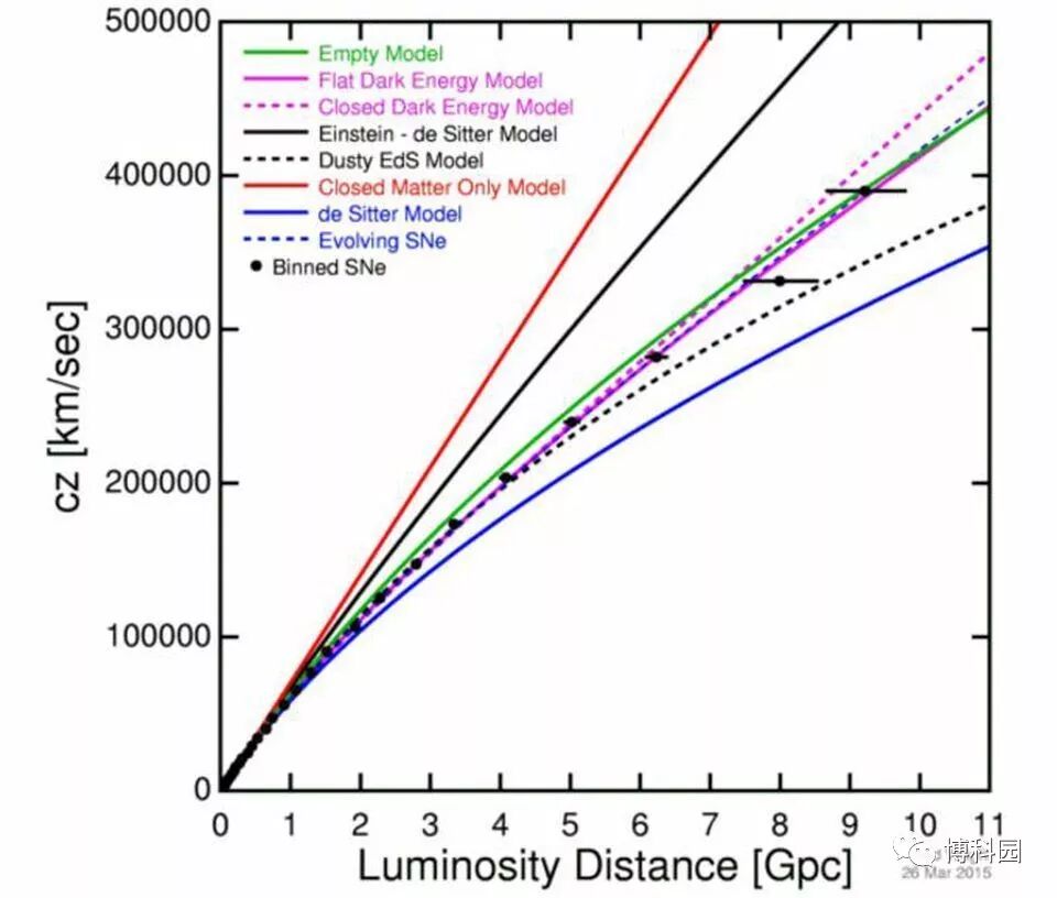 图注:一个明显的膨胀率(y轴)与距离(x轴)的图,与过去扩张得更快的宇宙是一致的,但现在仍在扩张。这是一个现代版的,比哈勃的原作要远不止几千倍。不同的曲线代表了由不同组成成分组成的宇宙。图片版权:Ned Wright, based on the latest data from Betoule et al. (2014)