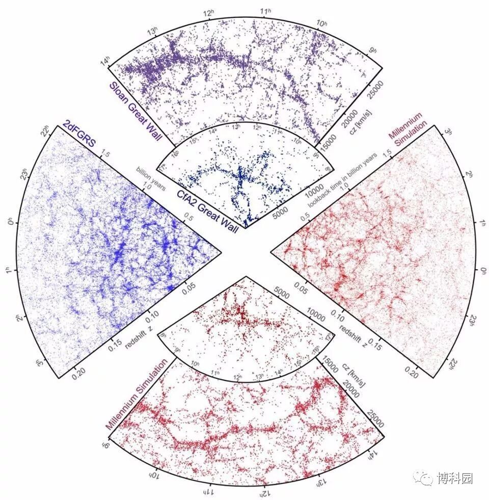 图注:在最大的尺度上星系聚集在一起的方式(蓝色和紫色)不能通过模拟来匹配(红色),除非包含了暗物质。图片版权:Gerard Lemson & the Virgo Consortium, with data from SDSS, 2dFGRS and the Millennium Simulation