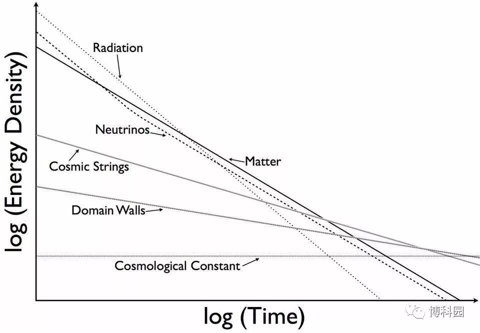 图注:宇宙能量密度的各个组成部分,以及它们可能占主导地位的因素。如果宇宙弦或畴壁存在于任何可观的量,它们将对宇宙的膨胀作出重大贡献。图片版权:E. Siegel / Beyond The Galaxy