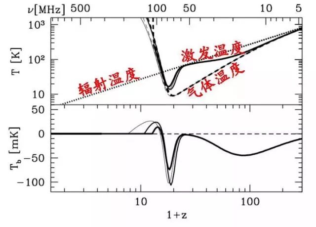 但激发温度实在是墙头草一枚:当宇宙年龄达到6500万年左右(红移~40)的时候,气体密度已经降低到原子之间的碰撞耦合不足以维持激发温度与气体温度的一致了,接下来激发温度就会单独被辐射温度”拐跑“,到红移~30时,激发温度已经再度与辐射温度几乎一致了,它们此时都大于气体温度。这段时间前后,光谱上的吸收特征消失了。