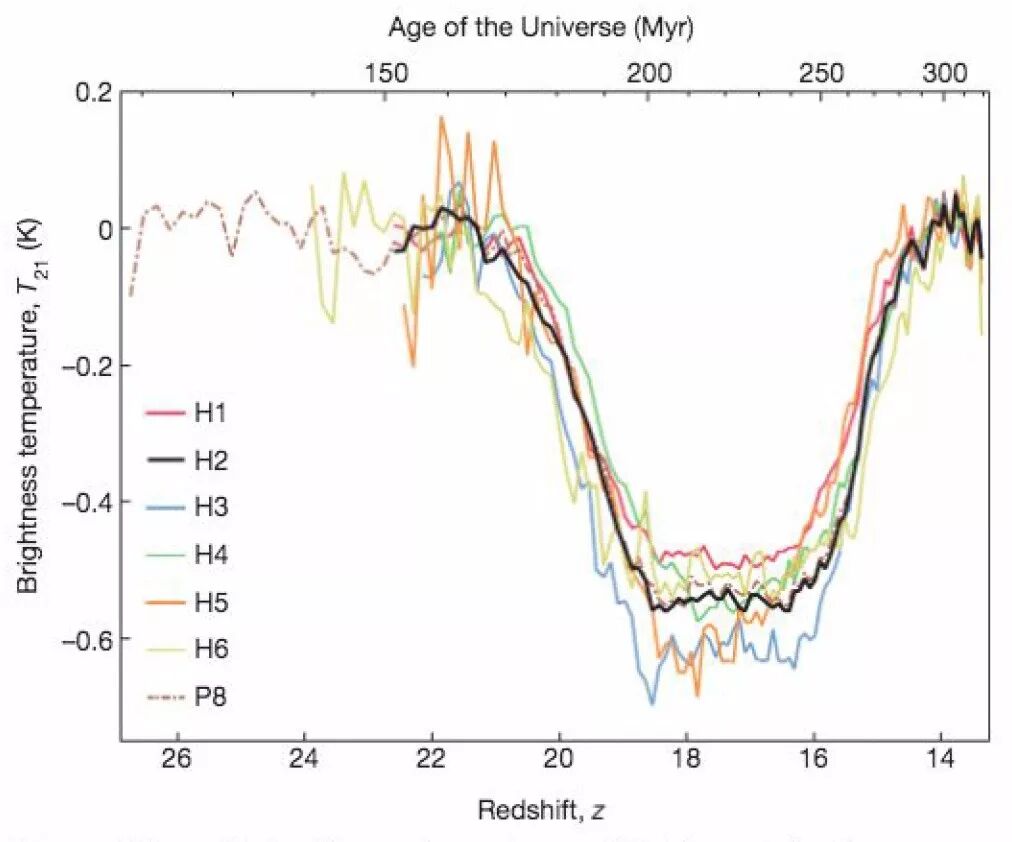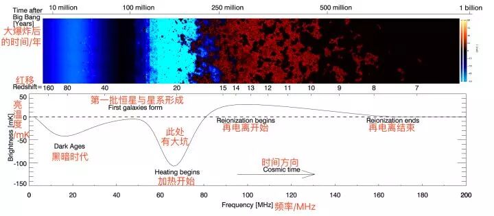 宇宙年龄2亿年前后由第一批恒星Lyman-α光子造成的21cm吸收坑。Bowman et al. 2018 Nature Letter