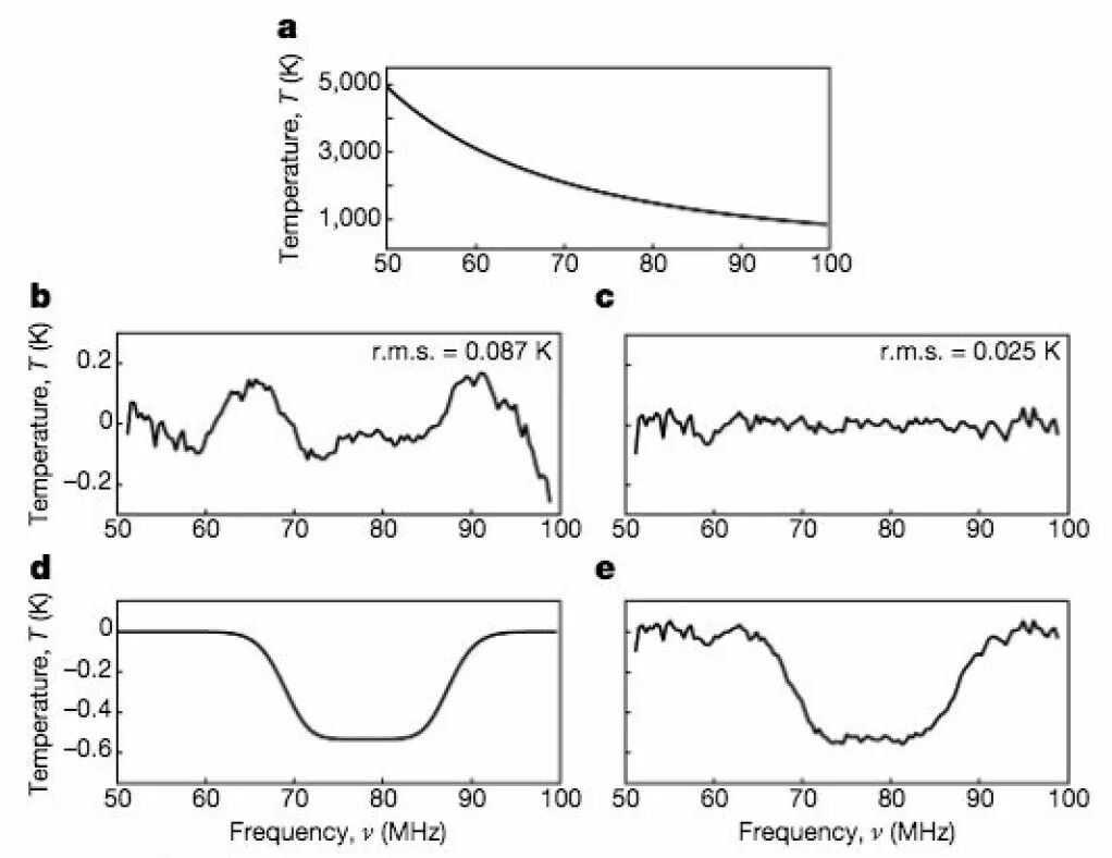 在对电离层物理进行建模之后,这项影响也被团队排除。剩下的,就是我们想要看到的第一批恒星对宇宙再电离时期的21cm吸收坑了。(下图 d、e 栏,分别为模型拟合结果和包含噪声的实测值)