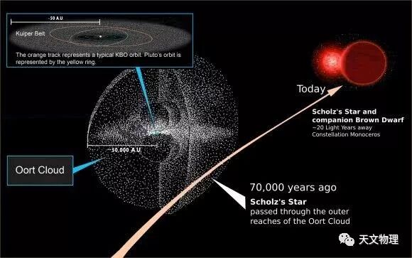 虽然这颗恒星距离地球近20光年,但它靠近太阳的方式改变了我们太阳系中一些彗星和小行星的轨道。7万年前当它来到我们的太阳系时,Scholz的恒星进入了奥尔特云。奥尔特云是一种大多数冰的物体的储层,它的范围从大约0.8到3.2光年不等。对奥尔特云的访问在2015年的一篇论文中首次被解释。这篇新论文跟进了这项工作,并展示了这次访问的影响。通过数值模拟,计算出了天空中所有这些双曲线物体似乎会出现的辐射或位置。