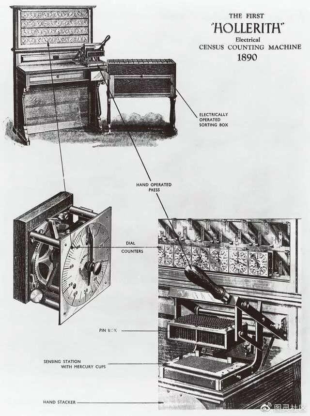 ▲ 霍列瑞斯人口普查计算机器 为美国1890 年的人口普查节省了一个数量级的时间。(资料来源:IBM 档案)