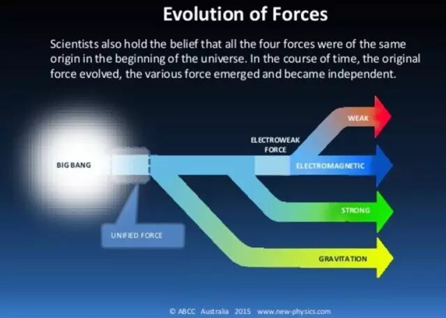 △ 在宇宙早期,当能量足够高时,引力也能够与其它的三种基本力统一在一个框架中。(图片来源:ABCC Australia 2015)