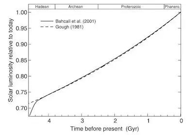 我们的太阳,就跟其他的恒星一样,似乎是永恒不变的。但事实上,它的年龄只比地球大一点。随着我们对恒星演化有着逐步加深的理解,我们知道恒星随着时间推移会逐渐变暖。数十亿年前,太阳的光度是今天的70%。这意味着早期的地球接受到来自太阳的热度要比今天的少。由于热量太过于少,以至于不能够维持液态水的存在。但从地质学的证据明确地表明,在地球年前的时候海洋是存在的。