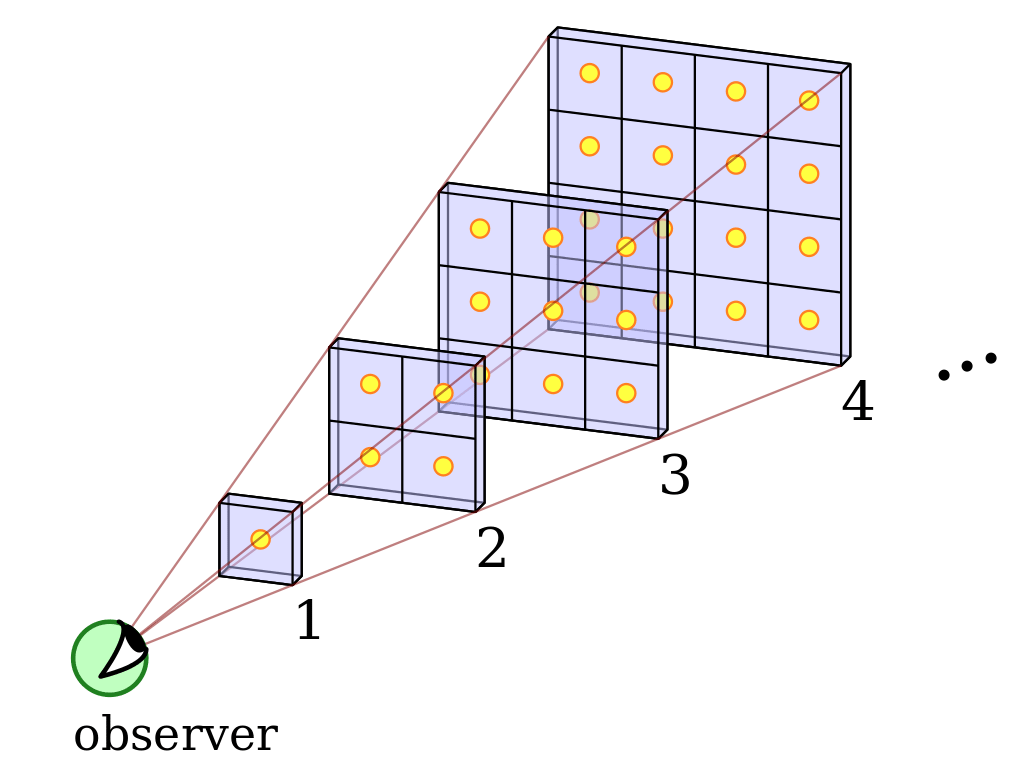 关于宇宙无限最著名的一个悖论是奥伯斯佯谬:如果宇宙是无限并且永恒的,那么为何夜空是黑暗的?乍听之下,这个问题的答案似乎显而易见。越远的恒星就越暗,因此遥远的恒星因为太过昏暗而无法看见。但是,在《引力的作用范围有多远?》中我们已经提到过,恒星的亮度遵从了一个非常特别的关系:平方反比定律。一颗一定距离的恒星亮度与距离两倍远的四颗类似恒星的亮度一致,以此类推。但是如果恒星的分布相当均匀,那么距离增加两倍恒星的数量就增加四倍。所以虽然恒星随着距离的增加变暗,但越远就代表数量越多。因此一个无限永恒的宇宙的天空应当是太阳一样明亮。