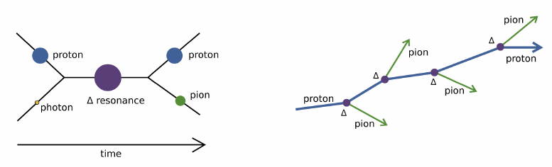 高能质子会撞上CMB的光子产生π介子,并把一部分能量传给π介子。(© Wolfgang Bietenholz)