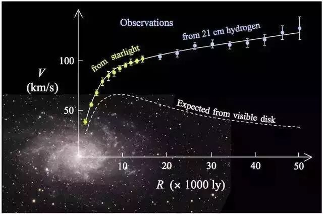 △ 星系自转曲线图。根据广义相对论,必须有许多看不见暗物质提供额外的引力来源才能维持整个星系。(图片来源:Stefania deluca)