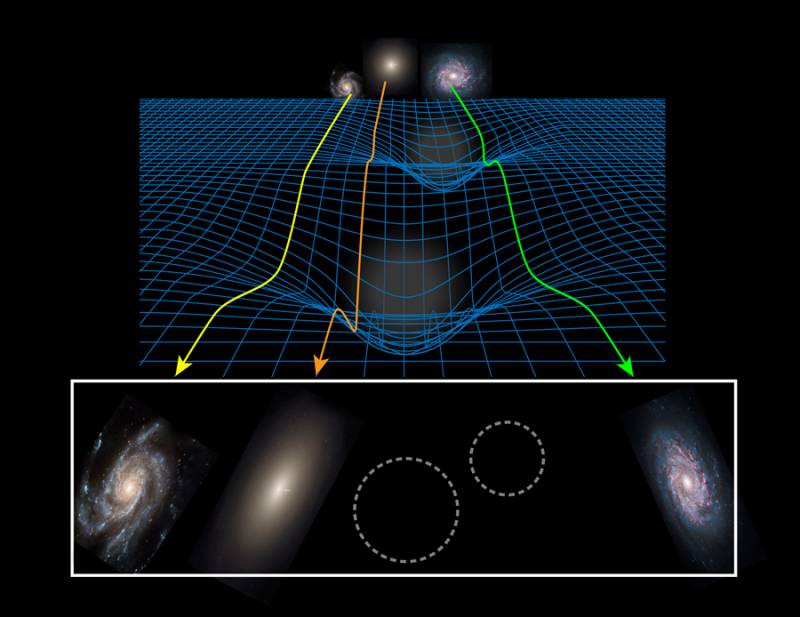 △ 星系的引力会弯曲空间,当光线经过这片空间时就会被弯曲。弯曲的光线允许天文学家测量星系的引力分布。(图片来源:APS/Alan Stonebraker/STScl/AURA/NASA/ESA/Hubble Heritage Team)