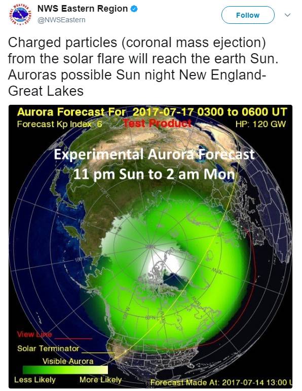 据CBS最新报道,本周末,太阳活动剧烈,等离子体大量地释放,预计将会导致巨大的地磁风暴,给新英格兰大部分地区带来观赏极光的绝佳机会!尤其是周日晚上,波士顿地区极有可能能够看见极光!