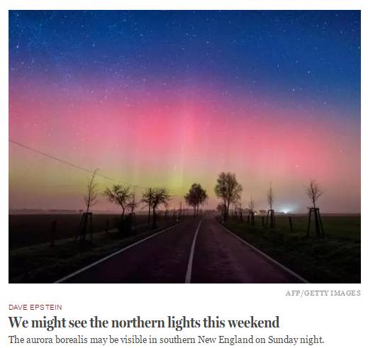 当然,这次巨大的电磁风暴不会为你的手机、网络带来什么重大影响,小伙伴们不用担心!而最重要的是,周日这一天,在高纬度地区会引发一次辉煌壮观的极光。通常情况下,极光会发生在北极,以及新英格兰北部。不过,本周日这场极光,新英格兰南部的小伙伴们都有机会观赏到!