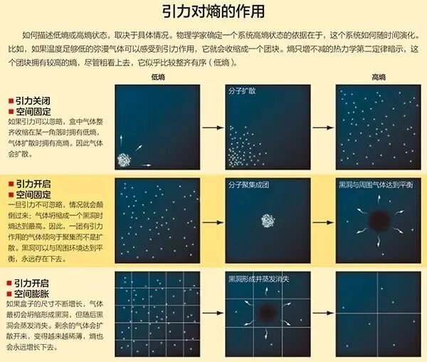 很明显,引力是宇宙演化的关键因素。可惜,我们还无法完全理解与引力有关的熵。引力源于时空的几何形状,不过我们目前还没有找到一个全面的时空理论——那是量子引力论苦苦追寻的目标。尽管我们可以把液体的熵与构成该液体的分子的运动状态联系起来,我们却不知道空间由什么构成,因此也就无法了解对应于某一宏观状态的引力微观状态究竟有多少。