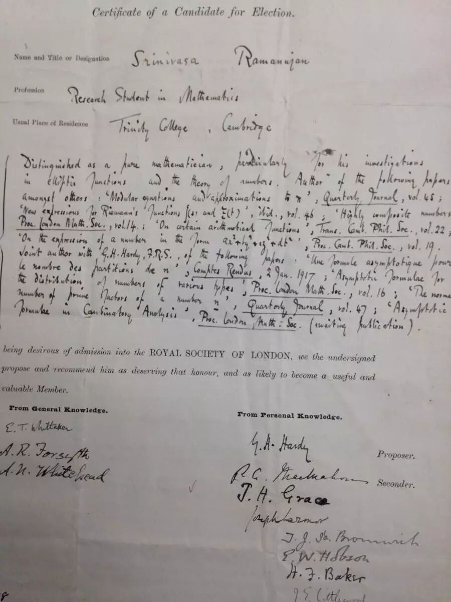 在拉马努金与哈代合写的论文中,其中有一篇震惊了整个数学界,这篇论文为困扰了数学家几个世纪的整数分拆,提供了一种可靠的计算方法。正是因为这篇论文,拉马努金才被提名为皇家学会会员。(对于任何科学家来说,能够当选皇家学会会员都是至高的荣誉。)当时,一些伟大的数学家都签署了他的提名,包括J. E. LittlewoodAlfred Whitehead、哈代以及很多其他人。1918年5月2日,年仅30岁的拉马努金被评选为英国皇家学会会员,成为有史以来最年轻的会员之一。