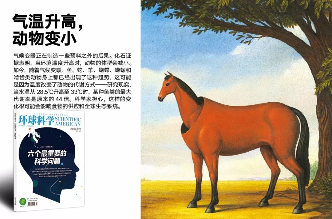 气候变暖正在制造一些预料之外的后果。化石证据表明,当环境温度升高时,动物的体型会减小。如今,随着气候变暖,鱼、蛇、羊、蝴蝶、蝾螈和啮齿类动物身上都已经出现了这种趋势,这可能是因为温度改变了动物的代谢方式——研究现实,当水温从28.5℃升高至33℃时,某种鱼类的最大代谢率是原来的44倍。科学家担心,这样的变化很可能会影响食物的供应和全球生态系统。