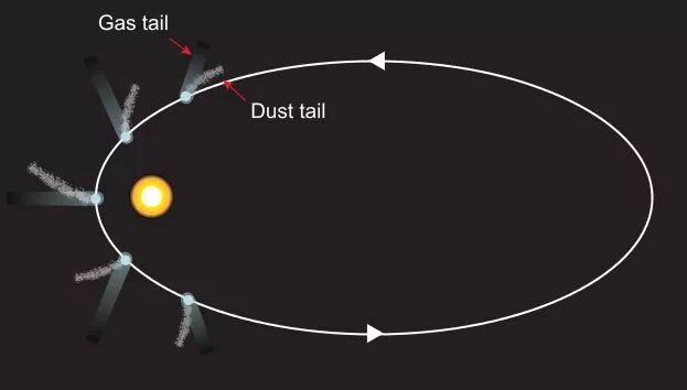 图中的Gas tail,即为彗星被太阳风吹拂形成的“气体尾”,也称“离子尾”。这个慧尾总是指向远离太阳的方向。(图片来源:维基百科)
