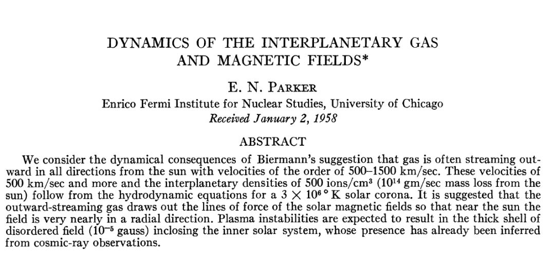 在一片苦痛中,帕克将希望寄予在了人类刚刚拥有的航天能力上。正如他1959年发表在地球物理学研究(Journal of Geophysical Research,业内简称JGR)那篇论文中所写: