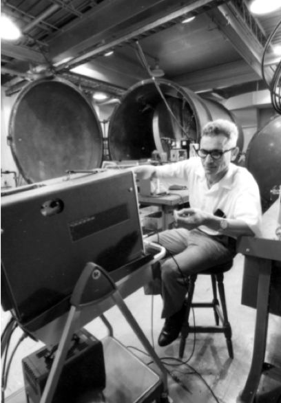 约瑟夫•韦伯正在查看引力波实验的显示屏。他的背后是一个真空箱,里面装着一台铝制探测器
