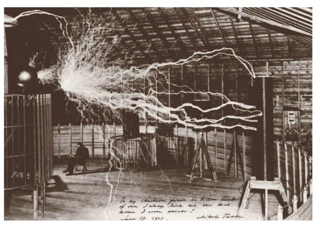 特斯拉被公认为世界上最伟大的电机工程师之一,由于他的许多发明具有开创性,而被公认为电机工程学的先驱。图2是特斯拉在他的尼亚加拉发电站实验室的照片,他所发明的几百万伏高压转换器产生的电弧长达几米,图中坐着的就是特斯拉本人。