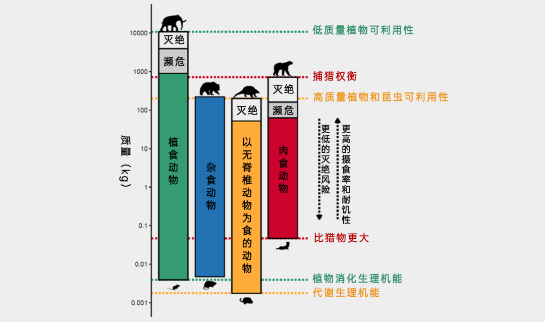 陆地哺乳动物中饮食和体型的U形关系。灰色部分代表目前濒临灭绝的物种,而白色部分则代表已灭绝的物种。(图/Nature Ecology and Evolution)