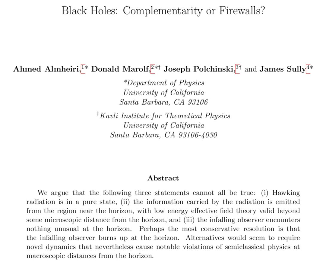 ○ 2012年,Polchinski与其它三位合作者提出了火墙悖论,使黑洞信息悖论变得更加扑朔迷离。| 图片来源:arXiv:1207.3123v4