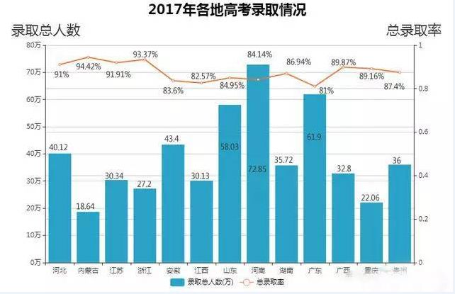 那么,四十年以后的今天,高考录取率是多少呢?2017年,有940万人参加高考,最后录取了700万,录取率高达74%。在个别教育大省如江苏、河北,录取率更夸张,高达91%。