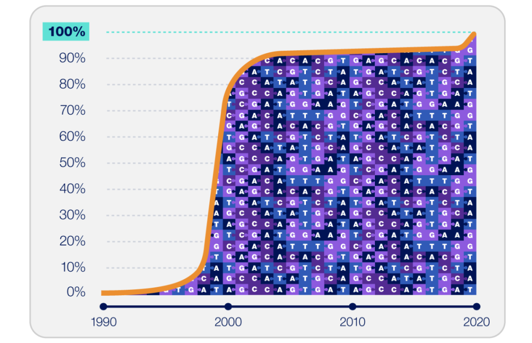 自1990年HGP启动,发布的人类基因组序列比例。| 图片来源:NHGRI
