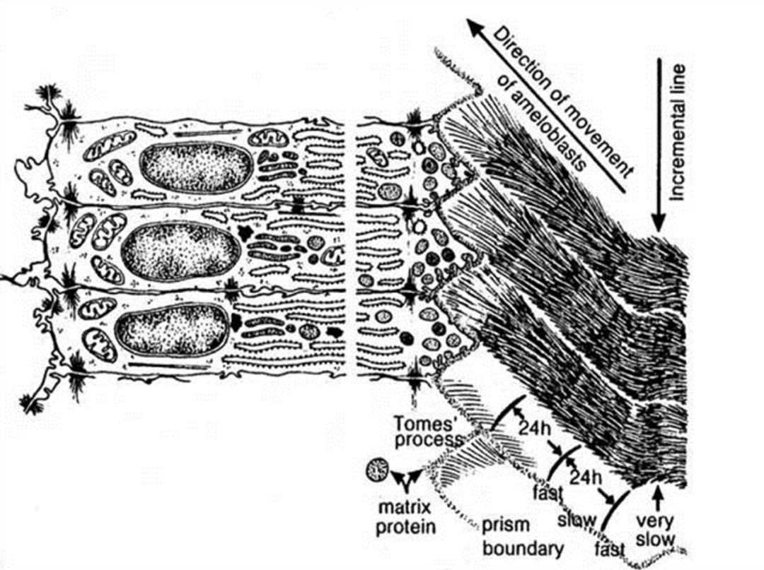 在一昼夜的周期内,成釉细胞会经历快速分泌和缓慢分泌的阶段;由于内部微晶取向问题,釉柱在快分泌阶段越长越粗,在慢分泌时段越生越细,因此在快→慢的转折点,釉柱最粗,慢→快的临界处,釉柱最细。每过24小时,釉柱增加一个最细圈和一个最粗圈。