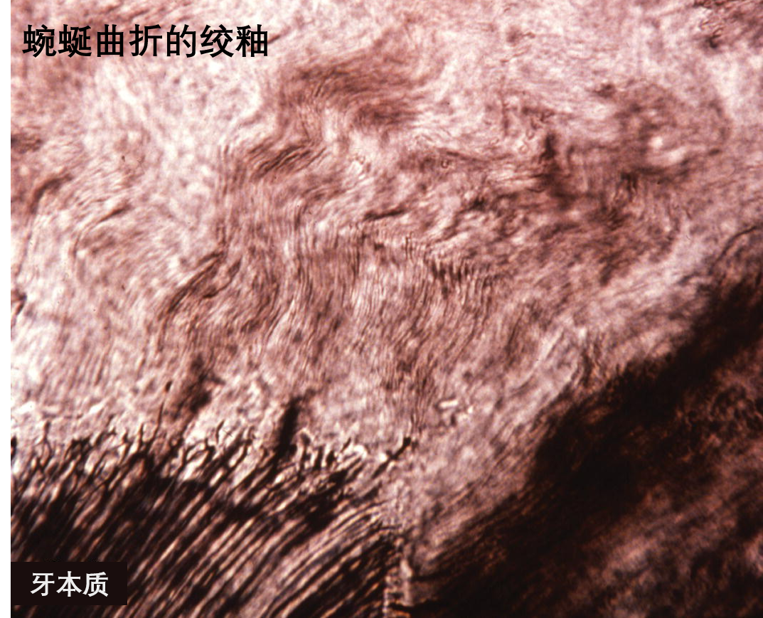 釉柱从牙本质和牙釉质的分界面,即牙本质釉质界(dentinoenamel junction,简称DEJ),出发并贯穿至牙表面,但釉柱生长的行程并不完全呈直线:近表面l/3的釉柱较直,称直釉;而靠内2/3的较弯曲,称绞釉(gnarled enamel)——尤其在切缘/牙尖部位,釉柱绞绕弯曲的情况更显著。