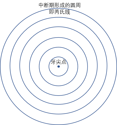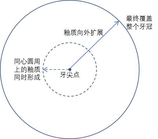 为便于理解,我们不妨搁置纵向维度,只关注釉质的横向扩张,并其理想化为一个圆的扩增——以牙尖点为圆心,向外展开,半径越长的圆周越晚形成,最晚形成的最外层圆周,对应釉质刚好覆盖整个牙冠的那一圈。(同一半径圆周上的釉质可以看成是同时形成的。)