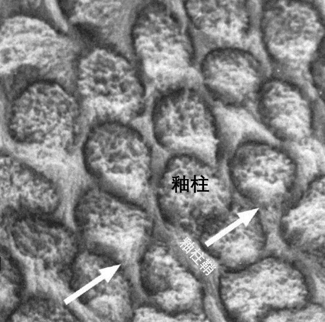 一个釉尾的左右两侧挨着两个釉头。相邻的釉头釉尾间存在明显间隙,间隙内填充着釉柱间质(interrod substance/enamel cement)。柱间质成分当然也是微晶了,但其整体结构不如釉柱本身致密。柱间质构成的弧形边界被称为釉柱鞘(enamel rod sheath)。