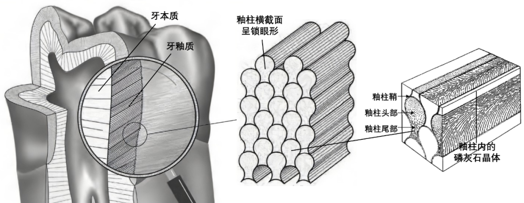 按照口腔组织学的定义,牙釉质的基本组成单位是釉柱(enamel rod),数以百万计,呈细长柱状;釉柱横剖面则为锁眼形状,有一个较大的头部和一个细长的尾部。每条釉柱由数以百万计的磷灰石微晶组成。