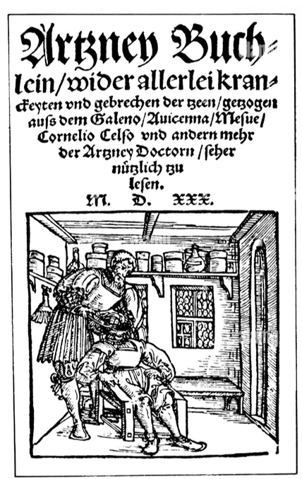 1530年,世界上第一本牙科治疗书籍出版,其作者是德国牙医阿兹尼·布赫莱因(Artzney Buchlein),书名为Artzney Buchlein: wider allerlei kranckeyten und gebrechen der tzeen,译作中文则为《各种牙科问题》[3]