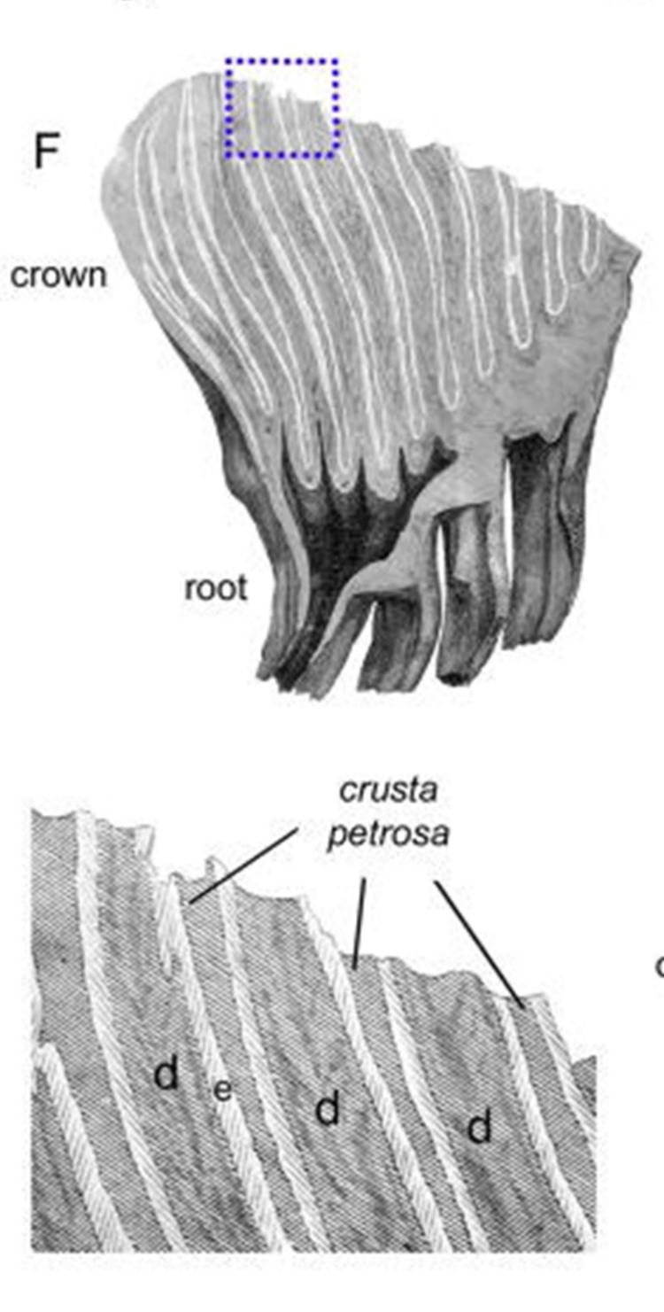罗伯特·布莱克绘制的大象臼齿切片,字母e代表cortex striatus,即牙釉质。[5]