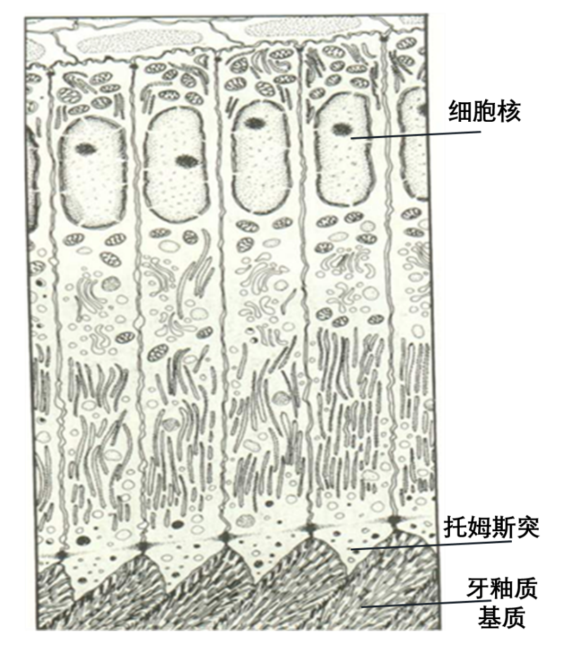 这些细胞“柱”的前身其实是短粗型的块状(在英文里可用“cuboidal”来形容),通过分化才长成了瘦高个儿。当然,关于它们此前如何猥琐发育,如何在牙本质界面上安营扎寨,如何做好“制釉”和“上釉”前的准备工作,纷繁往事暂且不表。