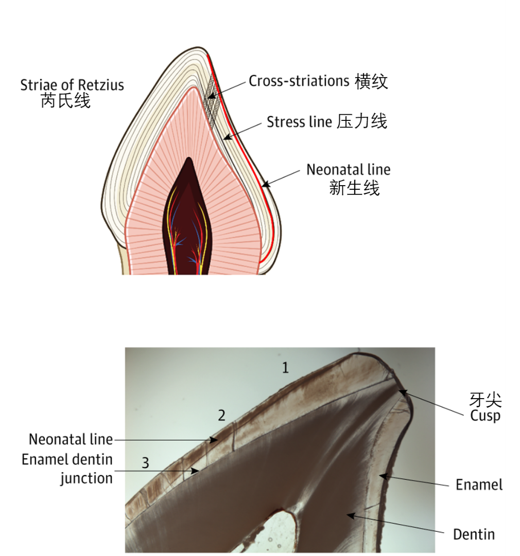 形成于胎儿出生阶段的新生线(neonatal line)是最浓重,也最具科学意义的压力线,因为出娘胎这件事之于牙釉质生长可谓超级压力源,而新生线不仅能被作为个体出生前后的分界,还给研究者提供了追溯母亲孕期压力史的参考。